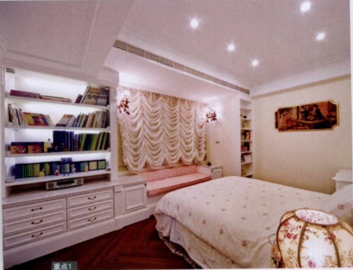 窗簾占空間視覺(jué)面積不小,所以窗簾的選擇也會(huì)影響空間氣圍及風(fēng)格。窗簾造型及材質(zhì)決定質(zhì)感,若想讓空間呈現(xiàn)浪漫夢(mèng)幻的優(yōu)雅,應(yīng)選擇古典、多層次的窗簾。窗邊規(guī)劃休閑窗臺(tái),連接旁邊的書柜,提升收納功能