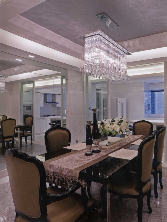 餐廳里運(yùn)用了大量鏡飾裝飾,這一扇墻面都是。在鏡飾的裝飾效果下,整個空間里亮度極限提升,再加上那個精美的水晶吊燈餐廳里典雅高貴的感覺一下子就出來了,低調(diào)的高雅就是指這里。