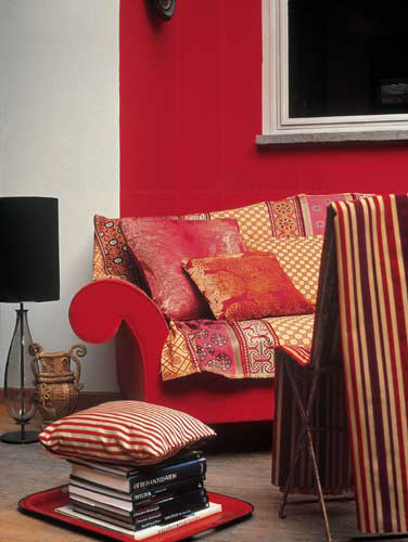 即使是西式的家居布置,同樣可以選用艷麗的東方風(fēng)格布藝做裝點(diǎn)。東方艷麗風(fēng)格布藝的紅色恰好與空間里的紅色墻壁、沙發(fā)屬于同一個(gè)色系,搭配出十分和諧的效果。西亞的建筑圖案與中國的傳統(tǒng)紋樣疊在一起使用,并且搭配了材質(zhì)相近、顏色相似的條紋布藝作為橋梁,令東方艷麗的風(fēng)格更為突出,與居室整體的風(fēng)格也更加諧調(diào)?!?br />