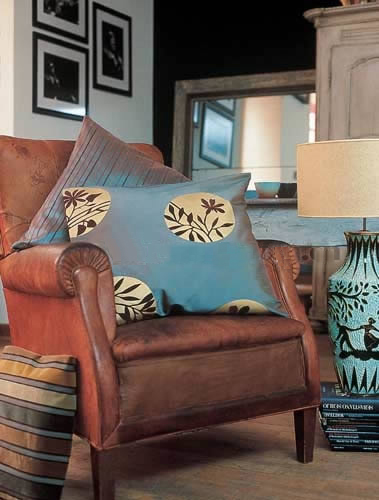 為高級(jí)而古老的真皮坐椅搭配靠墊,具有中國詩畫韻味的圖案成為獨(dú)特而高貴的選擇。清雅的灰色透露著濃縮的文化韻味,與另一個(gè)灰色緞面靠墊搭配起來更顯高貴,而坐椅旁邊的條紋靠墊向古老的氣氛中投入了古典的西方元素,讓整個(gè)角落的風(fēng)格多元起來。
