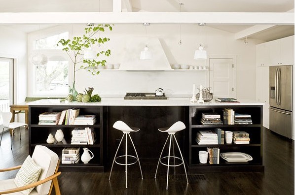 客廳與餐廳的中間還有這樣一個臺子,它的功能是雙向的。對于廚房它是非常實用的料臺,而對于客廳,它又是一個收納空間??梢允占{非常多的需要收納的物品。而上方的燈具也是非常有特色。