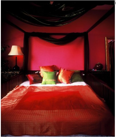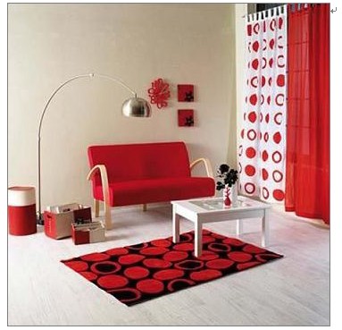 居室色彩搭配應(yīng)考慮突出主色來(lái)進(jìn)行裝飾,而不是考慮到某個(gè)突出的東西。圍繞主題色來(lái)進(jìn)行色彩搭配,這樣搭配起來(lái)更精致,比較有韻味,更耐看。例如:鮮明的紅色背景墻面使人精神振奮,而紅色床品與背景墻面色彩呼應(yīng),黑色的幔簾和床架都與紅色完美搭配。所有的居家布藝色彩一定要和背景色主色基調(diào)相配。