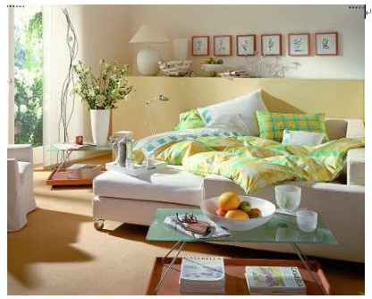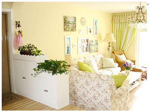 綠意濃濃的居室色彩搭配,綠與白的窗簾、靠枕色彩一致,大面積乳白色、暖黃色背景墻與沙發(fā)、布藝,共同營(yíng)造了一個(gè)溫馨而暖意洋洋的居室空間。