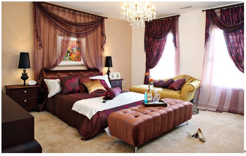 紫紅的色彩,精美的床頭裝飾與窗簾,配上精致的臺(tái)燈,使人一入臥室,便陶醉于浪漫的愛(ài)情氛圍之中。