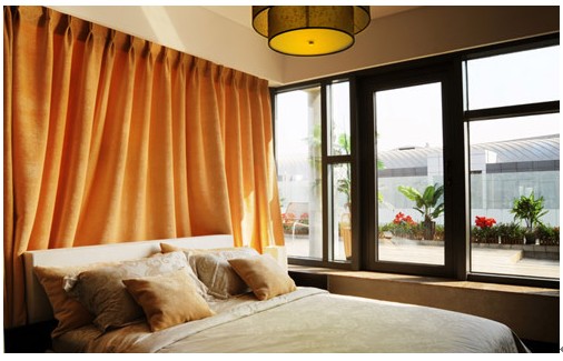 臥室床頭搭配了大面積橘紅色裝飾簾,打造出很好溫馨效果,而窗外綠色的植物讓盎然生機(jī)躍然眼前,使人在一覺(jué)醒來(lái)便可以感受到大自然的氣息,暖洋洋的陽(yáng)光灑滿整個(gè)居室,帶來(lái)一整天的好心情從這里開(kāi)始。