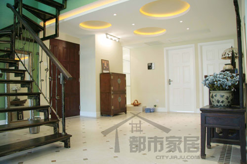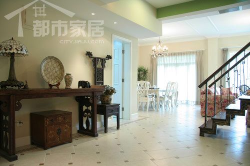 這是初進(jìn)門時(shí)展現(xiàn)在我們眼前的情景。明亮的日光透過(guò)紗簾來(lái),整個(gè)房間沒(méi)有太多隔斷,感覺(jué)上開(kāi)闊通透極了。左側(cè)的一組中式家居配飾搭配很醒目,紅木條幾、小木柜、瓷盤瓷瓶、老式臺(tái)燈以及一把靠背超高的凳子,這租搭配其實(shí)是隨心所欲而為之的,卻顯然成為了別墅入口處最隆重的一角。