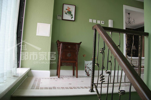 上樓上瞧一瞧去。和別處不同,樓道是泛著灰調(diào)子的綠色空間,柔和而雅致。顏色的運(yùn)用很重要,就拿這綠色來(lái)說(shuō),它經(jīng)常被運(yùn)用在歐式別墅中,已經(jīng)成為了一種經(jīng)典、正統(tǒng)的搭配。然而太艷會(huì)顯得淺薄庸俗,太暗又會(huì)顯得陰郁沉悶,拿捏得恰到好處才是設(shè)計(jì)師的功力所在。不看別的,光是這綠色的調(diào)配就能傳達(dá)出房子的源自經(jīng)典的品味。
