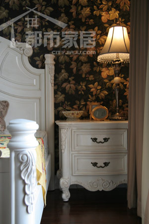 顏色的重要性同樣體現(xiàn)在主人的臥室里。黑色的花朵壁紙,沒(méi)錯(cuò),設(shè)計(jì)師用的就是大膽而絕配的黑色壁紙,一下子就烘托起神秘、幽靜的氛圍來(lái)。然而因?yàn)橛辛硕涠涮S的白色花團(tuán)的點(diǎn)綴,墻面一點(diǎn)兒也不顯得壓抑。臥室里的家居配飾一律為歐式風(fēng)格。