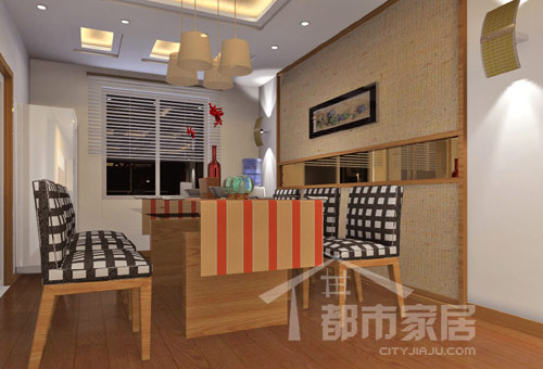 餐廳的裝飾也以低調(diào)淡雅為主,背景墻腰部鑲嵌了一道茶色鏡子,上面掛著水彩畫,簡簡單單的裝飾還原了家居生活樸實的本質(zhì)。木質(zhì)的餐桌椅雖然沒有時尚先鋒的氣質(zhì),卻舒適自在,富有親和力。