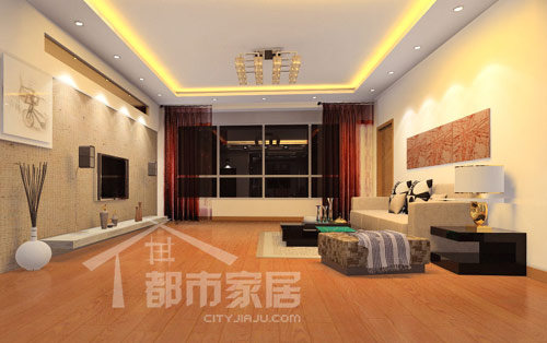 沙發(fā)和電視背景墻的亞麻色非常接近,有利于空間的統(tǒng)一協(xié)調(diào)。陽臺處酒紅色的窗簾給人華麗感的視覺沖擊,調(diào)和了米色與亞麻色的平淡低調(diào)。