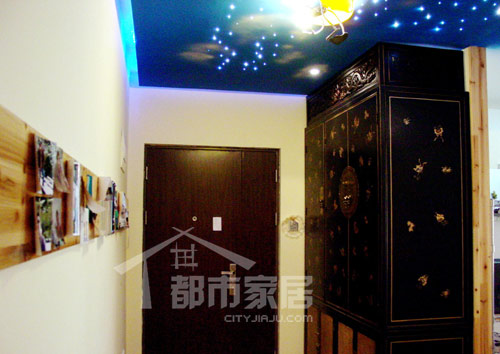 最獨(dú)特的要數(shù)天花板的處理了,藍(lán)藍(lán)的閃閃的,就像是晴朗的夜空一般迷人。設(shè)計師解釋說:“此處的效果實(shí)現(xiàn)方法其實(shí)很簡單,先用普通的石膏板吊頂,然后在石膏板上做出很多直徑1厘米左右的小孔,最后在小孔內(nèi)部放置光纖就可以了。光纖的顏色可以隨意變換,星星點(diǎn)點(diǎn),神秘而浪漫。”