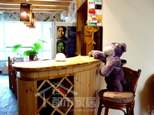 廚房和餐廳之間原本是有實(shí)體墻隔開的,為了營造閑適野趣的生活氛圍,設(shè)計師拆掉了這堵墻,取而代之的是這個松木的吧臺。吧臺中部的藏酒格讓人聯(lián)想到樸實(shí)可愛的東南亞小酒館。
