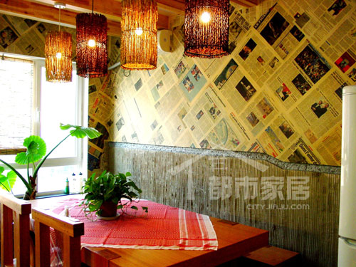 餐廳是一個尤其特別的空間,首先我們會被滿墻的英文報紙給吸引住,很奇特的裝飾手法!報紙整齊地斜鋪給空間帶來韻律感,圖文并茂又讓人不禁想要關(guān)注其中的故事,泛黃的顏色在這里營造了一種懷舊的氛圍,這是整個餐廳最驚艷的一面。是壁紙嗎?設(shè)計師解釋道:“這其實(shí)是真正的報紙,是業(yè)主收集的關(guān)于某次事件所有報道的報紙,很有紀(jì)念意義。我們把報紙緊緊貼在墻上,然后在報紙上刷一層清漆,這樣報紙就完全被封在漆里,不會再變形變色了?!?/FONT>