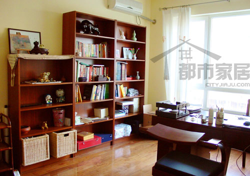 功能性使然,書房的風(fēng)格比較嚴(yán)謹(jǐn),簡單的木制家具和藤編收納框營造出恬淡的氣氛。