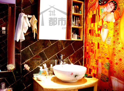 最為讓人意外的畫面就在這里出現(xiàn)了!沒錯,就是這幅金燦燦的玻璃彩繪,猛一看有點(diǎn)詭異吧~至少小編是這么認(rèn)為的。設(shè)計師告訴我們:“其實(shí)這是一幅法國名畫《吻》,只是把畫中女人的臉換成了業(yè)主女友的臉?!迸?,原來如此,是名畫與真人的拼接啊,難怪有那么點(diǎn)詭異的效果,呵呵。
