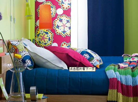 熱鬧的色彩撞擊,酷似夏季熱鬧的街頭,各種漂亮的顏色撲面而來,一暖一冷的窗簾和床品,還有披毯相互呼應(yīng),讓這個(gè)房間不會覺得沉悶,布藝不同圖案不同色彩,成為點(diǎn)睛之筆,讓整個(gè)臥室空間感充滿現(xiàn)代感和活力。
