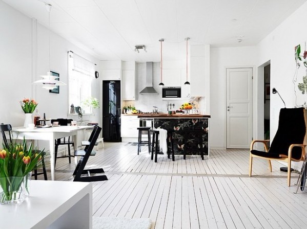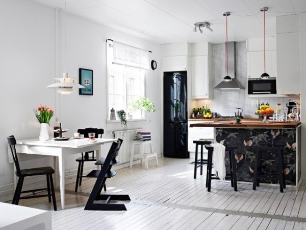 黑白配無(wú)論是在時(shí)尚之都還是設(shè)計(jì)師的筆下都是永恒的經(jīng)典。本案的墻面與地面都大量運(yùn)用了白色,餐廚空間里在家具上運(yùn)用了黑色,搭配的結(jié)果是非常有品位的。從擺設(shè)上我們輕易能看出這是一個(gè)三口之家,餐桌旁邊那個(gè)貼心的兒童椅讓寶貝同父母一起用餐,心理學(xué)家說這樣可以從小培養(yǎng)孩子的社會(huì)認(rèn)同感。