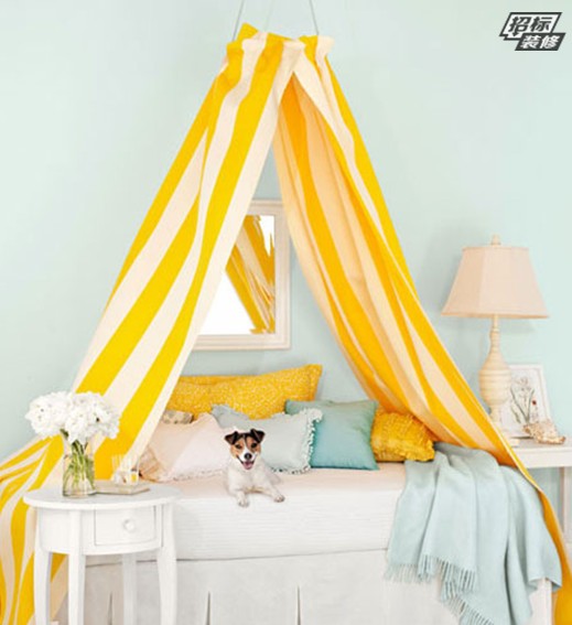 水鮮的色彩搭配甜味、清爽味爆棚,主題墻面色彩鮮明的水藍(lán)色,黃白條紋的飄簾很好地襯托了主題墻。床上鋪以白色床單和藍(lán)色薄被,以及水藍(lán)色靠枕,都強(qiáng)調(diào)的主體色。白色床邊桌擺放的花瓶和造型精美的臺(tái)燈,現(xiàn)代感十足。
