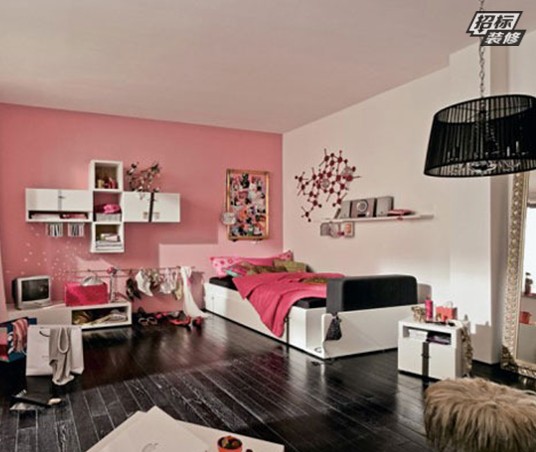 一面粉色墻占據(jù)大部分背景,粉紅色作為主色調(diào)設(shè)計(jì),給人以浪漫、甜美的感覺(jué)。粉紅色背景墻面搭配墻面裝飾,體現(xiàn)出女性的柔美與浪漫。黑色的木地板和黑色吊燈相呼應(yīng),在女性甜美氣息中加入一絲知性成熟感。白色的家具是調(diào)節(jié)整個(gè)空間色調(diào)的一筆。