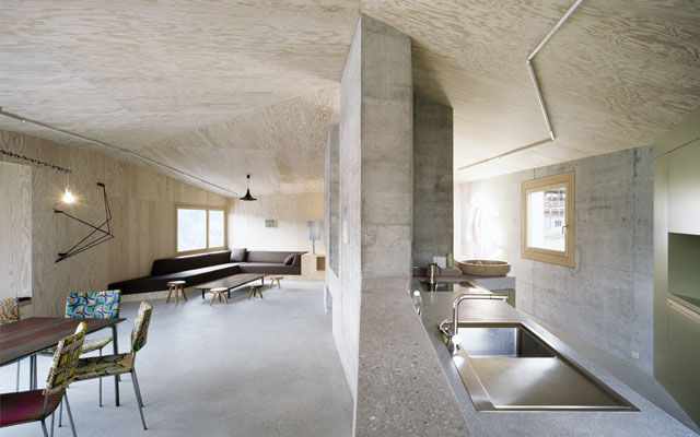 只需要在玻璃上寫些什么就可以打破它的透明感,改變視角。內(nèi)部的空間是靈活的:隔板和洗手池是水泥的;天花板和起居室的表面是用打蠟的美國(guó)冷杉做的。深淺不同的灰色調(diào)地板經(jīng)樹(shù)脂處理過(guò),既美觀又實(shí)用,保養(yǎng)方便,帶著工業(yè)的氣息。眾多表現(xiàn)元素和建筑元素的疊加給人帶來(lái)單純的感動(dòng):本質(zhì)的柔軟和水泥的冷淡帶來(lái)的效果令人吃驚。