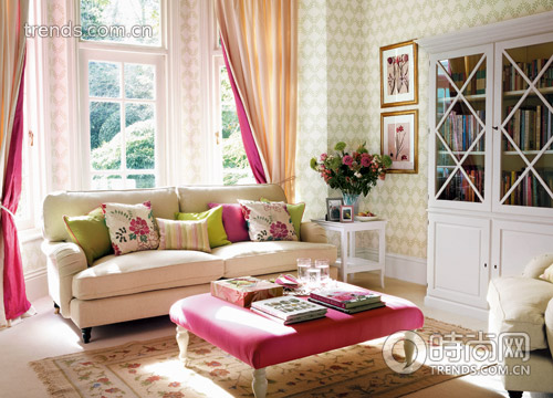 為平淡的空間加入一至兩種主題色彩,能迅速獲得驚艷的效果。有了顏色作為裝飾主線,無需再加入過多的配飾。如果房間里的輔助色彩用于墻面等大面積裝飾,那么主題顏色的使用面積就要相對小些。比如這里的粉色沙發(fā)凳,還有雙面窗簾中隱約出現(xiàn)的粉色。總之,主題色不能超過整體色調(diào)的10%。用靠包、鮮花等與主題色相呼應(yīng),令空間造型更顯完整和專業(yè)。