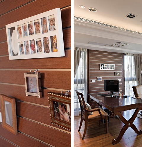 在公領(lǐng)域上,書桌的擺設(shè)點(diǎn)出閱讀的場域,并藉由壁面上木板溝縫,變化出可自由更換勾掛照片天地。