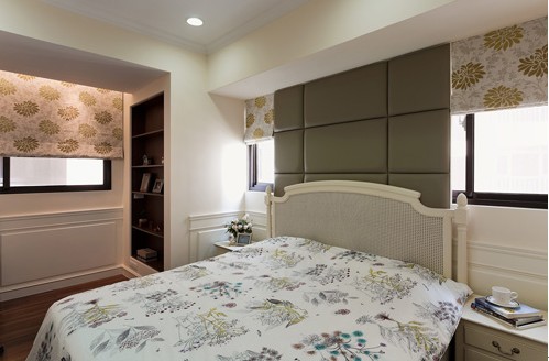 床頭運(yùn)用了印花卷簾設(shè)計,兼顧美感的同時也穩(wěn)定了睡眠的質(zhì)量,衣柜部份頂天的柜體,各類物品輕易分門別類。透過線板的造型,在壁面上設(shè)計出簡約的華麗美感,讓臥室有了低調(diào)的質(zhì)感。