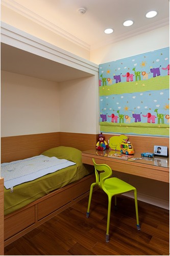 原木色加以綠色點(diǎn)綴,輕古典里透露出繽紛的局面,色彩艷麗的卷簾突出空間的主題性,床邊木色壁面貼皮帶出了溫暖的質(zhì)地。在度假中享受這空白般的愜意,也是設(shè)計師給小朋友的生活體驗。