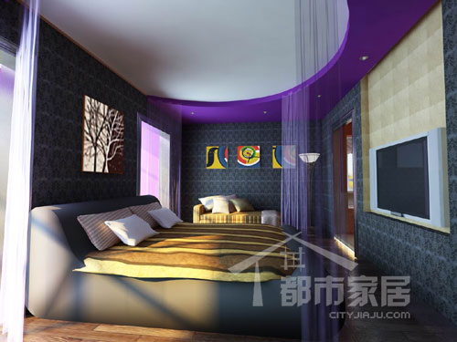 臥室的天花板上做了弧形的吊頂,不僅如此,設計師還沿著吊頂?shù)幕⌒螔炱鹆怂牡雷仙拇辜?,浪漫而靜謐的氛圍油然而生。講究情調的女士多半偏愛帶有幔帳的床,可是這里的層高根本不夠,于是設計師就做了淺淺的吊頂,掛上薄紗,這般風情一點兒也不輸給有幔帳的睡床呢。