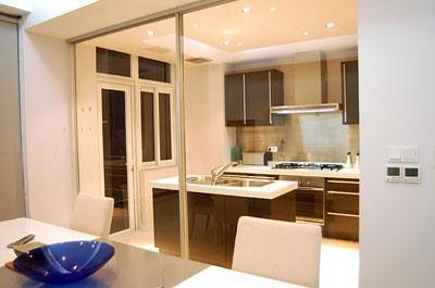 敞開式,理論上是將廚房與餐廳或客廳相連的一面非承重墻打掉,使廚房與餐廳合二為一。由于東方人的飲食習(xí)慣與西方人有較大區(qū)別,因此,設(shè)計(jì)師對(duì)敞開式廚房作了有中國(guó)特色的改造。如用一面玻璃磚墻加以分隔,既保證了油煙不外散,又可利用玻璃磚墻打造透光和折射光線的效果,使內(nèi)外都感覺到明亮和通透。