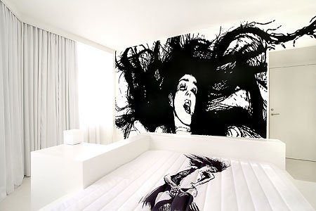 于零五年四月開幕的HotelFox,位于丹麥?zhǔn)锥几绫竟?,它的出現(xiàn)震撼了酒店及涂鴉藝術(shù)界。該酒店邀請(qǐng)了全球十三個(gè)國(guó)家,共二十一位著名涂鴉藝術(shù)家、插畫設(shè)計(jì)師,把原本三星級(jí)的舊酒店改頭換面,六十一個(gè)房間配以六十一種不同的裝飾設(shè)計(jì),不再是獨(dú)沽一味,充滿年輕活潑感覺。