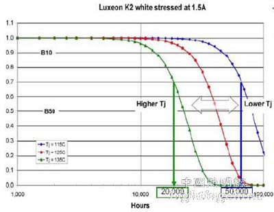 實(shí)際上,LED壽命問題主要是由于長期在高溫下工作而形成的問題。在不同結(jié)溫時(shí)的壽命如下圖所示: