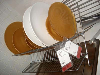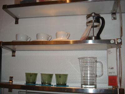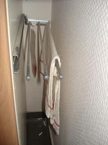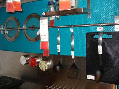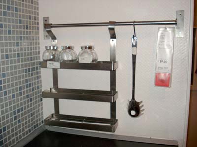另一面墻上的掛桿,微波爐手套、圍裙等廚房用品就可以掛在這里,方便又整潔。這個(gè)掛鉤的價(jià)錢也不貴,僅花14.9元就可以在宜家里買到。