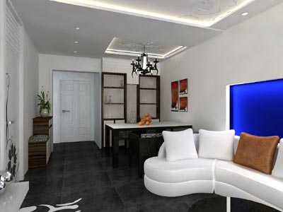 相信大家都會覺得,乍一看客廳沙發(fā)背景墻的用色還真夠大膽,設計師對此有什么說法呢?他解釋道:“我自己也想過用這樣夸張的顏色,業(yè)主可能不好接受,但我最終還是決定了這樣來做。因為客廳的空間比較狹窄,從沙發(fā)到電視墻之間也就三、四米,因此沙發(fā)背景墻不可再做立體造型或者復雜的圖案了,于是我就做了這么一個相當簡單的墻面造型,為了不使它太過單調,我只有在顏色上凸顯它的裝飾效果。同時藍色和白色之間起的對比也使空間更有層次?!?/FONT>