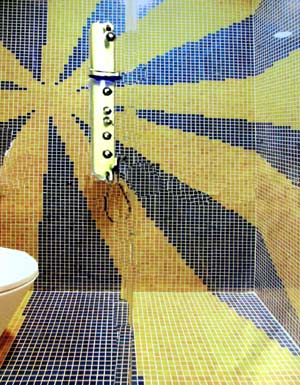 這張劉設計師展示給我們的衛(wèi)生間效果圖看起來實在夠獨特。墻面的馬賽克鋪貼得像一朵正在盛開的菊花一樣,設計師解釋說:“這就是我的秘訣所在了。張開的花瓣造型在視覺上有極強的擴張力,讓我們幾乎感受不到這個空間的局限和束縛。之所以選用黃色和藍色也是因為它們的對比效果比較明顯,能給人明亮潔凈的印象,比較適合衛(wèi)生間?!痹瓉硎沁@樣?。看蠹以谛蕾p這個風格鮮明、個性突出的衛(wèi)生間時,是不是忘記了它4平米的真實大小呢?