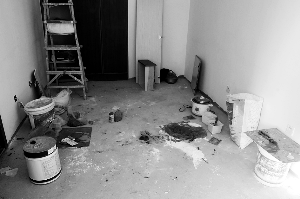 衛(wèi)生間內(nèi)已經(jīng)刷了一層防水,未干。臥室房間已經(jīng)用水泥找平,等待鋪地板,地面干凈,未見雜物。
