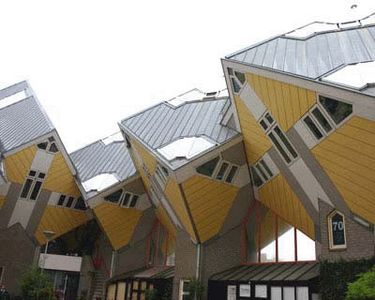 這個(gè)立方體房屋建于荷蘭,設(shè)計(jì)師把傳統(tǒng)的房子轉(zhuǎn)了45度,架在一個(gè)六邊形的柱子上,這樣三個(gè)面朝上,三個(gè)面朝下。每個(gè)房子有三層,底層包括廚房、書房和浴室,中層是臥室,頂層則是一個(gè)金字塔式的閣樓。
