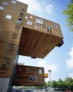 90年代末“沃佐科住宅(Wozoco Apartments)”是建在荷蘭阿姆斯特丹市的一種外掛式住宅,荷蘭的房屋設(shè)計(jì)規(guī)定公寓必須為住戶提供足夠多的陽光,由于有限的樓層高度和南北向的條件限制,100套公寓不可能放置在一個(gè)常規(guī)的體塊中,最多只能容納87套,為了解決高密度問題,所以設(shè)計(jì)師把另外的13個(gè)公寓掛在外面