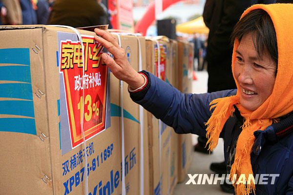 概要: 農(nóng)民在家電下鄉(xiāng)中購買彩電、冰箱等產(chǎn)品,將得到銷售價(jià)格13%的財(cái)政直補(bǔ)。2月1日,江蘇省“家電下鄉(xiāng)”工作正式啟動(dòng)。江蘇省興化市戴南鎮(zhèn)的王巧云來到鎮(zhèn)上的“家電下鄉(xiāng)”直營店選購洗衣機(jī)。