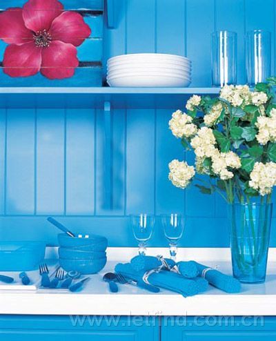 為廚房打造大海般蔚藍和寧靜,除了以藍色櫥柜為基調外,還需要沿用藍色的餐廚用具:藍色的碗、藍色的盤子、甚至用餐時握在手中的餐刀、餐叉和小勺也是選擇藍色手柄的產(chǎn)品。從廚房的餐桌,把每一種物件的顏色都統(tǒng)一起來,打造出純美、浪漫的整體風格。