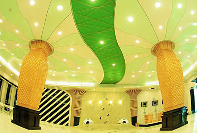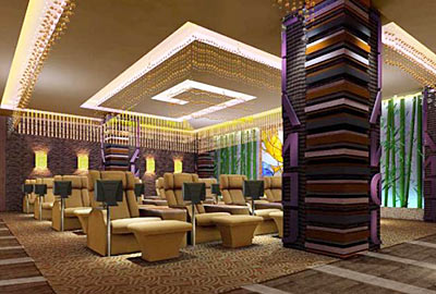 天都桑拿休閑中心位于深圳市布吉坂田,建筑面積2000平方米. 該桑拿休閑中心根據(jù)宇宙天體的概念進(jìn)行設(shè)計(jì)。前廳天花以太陽系為主題,中間的大圓代表太陽,周圍的小圓代表小行星。色彩以藍(lán)灰色為主,用LED,暗藏光制造一種神秘的氣氛。前廳地面中間用曲線型的玻璃代表小河,墻體用文化石和聚晶玻璃形成鮮明對比,地面用青石板代表粗糙的星球表面,整個(gè)空間和諧生動(dòng)富有情趣。