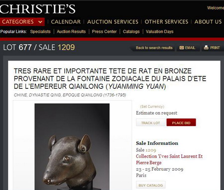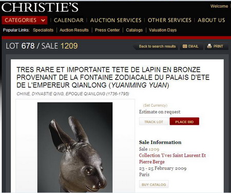 2008年7月,法國佳士得拍賣行發(fā)布公報宣布,將于2009年2月舉辦“伊夫·圣洛朗與皮埃爾·貝爾熱珍藏”專場拍賣會,鼠首和兔首銅像出現(xiàn)在此次拍賣會的拍品名錄上,引起各界廣泛關(guān)注。