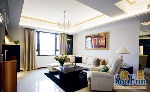 從陽臺(tái)看向客廳:白色沙發(fā)與黑色烤漆的電視柜形成色彩呼應(yīng)。墻壁上的時(shí)尚畫框渲染出空間的熱鬧。