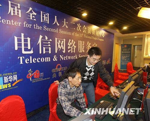 概要: 2月26日,十一屆全國人大二次會(huì)議、全國政協(xié)十一屆二次會(huì)議新聞中心正式開展工作。新聞中心位于西長安街北側(cè)的梅地亞中心,負(fù)責(zé)接待和安排中外記者對(duì)會(huì)議的采訪。第十一屆全國人民代表大會(huì)第二次會(huì)議和政協(xié)第十一屆全國委員會(huì)第二次會(huì)議,將分別于3月5日和3月3日在北京開幕。新華社記者邢廣利攝2月26日,新華社的工作人員劉宗民(左)和李潔原在電信網(wǎng)絡(luò)服務(wù)室調(diào)試設(shè)備。