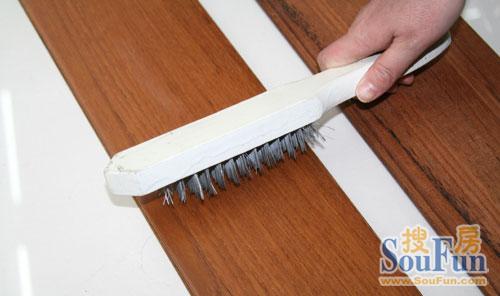 世友:既然是抗刮痕地板,那么我們自然先要做極限耐磨測(cè)試。將地板固定好,然后使用鋼絲刷在地板面上使用強(qiáng)力來回磨擦。實(shí)驗(yàn)結(jié)果讓編輯有些意外,原本以為這樣極限的測(cè)試多少會(huì)有少許刮痕出現(xiàn),但在測(cè)試后發(fā)現(xiàn)地板表面沒有留下任何刮痕,表面光滑依舊,絲毫看不出測(cè)試的痕跡。]