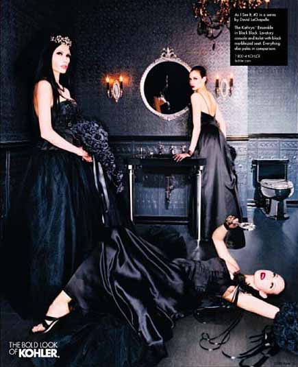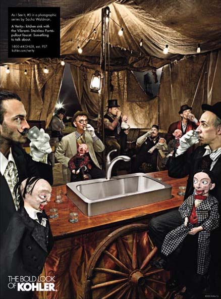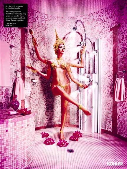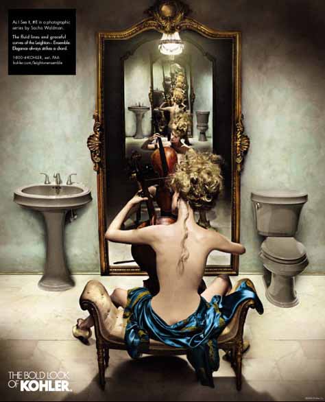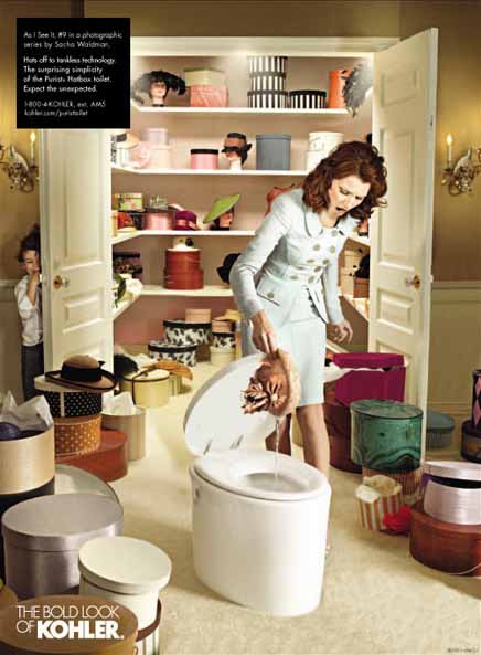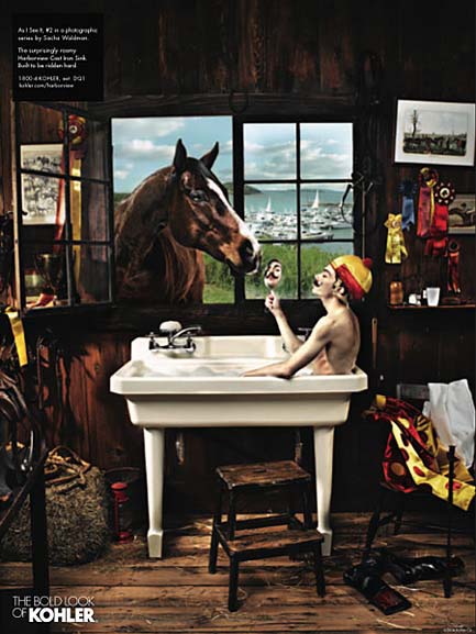 初看Kohler的這幾組雜志廣告,首先是被畫面豐富的故事性所吸引,然后才注意到產(chǎn)品——這與一般廣告突出產(chǎn)品的做法極為不同。同時,與一般強調產(chǎn)品清潔干凈質感的表現(xiàn)方法不同,幾位出色的攝影師戲劇性甚至有點超現(xiàn)實的表現(xiàn)手法也頗讓我吃驚。