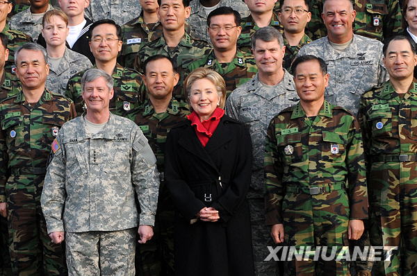 2月20日,在韓國(guó)龍山駐韓美軍基地,美國(guó)國(guó)務(wù)卿希拉里(前排中)與駐韓美軍司令(前排左)夏普及韓美軍官合影。