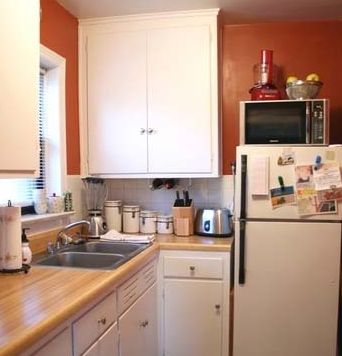 3.電冰箱和洗滌槽柜中間放帶腳輪的調(diào)味品架,既解決了存放問(wèn)題,又達(dá)到了間隔效果。