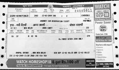 售票員接過記者填好的乘客信息單,將相關(guān)信息輸入電腦,很快,一張巴掌大小的紙片從打印機中出來。記者如數(shù)把錢遞了進去,他清點之后把那張紙片遞了出來。這就是印度的火車票?!記者感到很好奇。票面上清楚地印著記者剛才填寫的主要信息(見上圖)。除了這些,還有一些廣告。