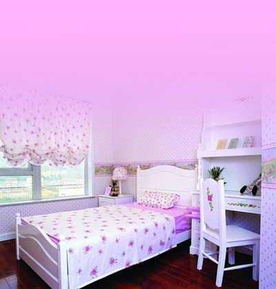 簡潔設計的最大難點便在于不能使空間過于呆板,此時設計師對線條把握就顯得至關重要,女兒房間(次臥)里加強了純白和淡粉色的色調(diào),強化了女性情懷的別致,同時又與臥室和客廳的家具用了統(tǒng)一的簡歐式造型,雖然白色的床略顯蒼白,但柔美的線條頓時讓內(nèi)容豐富了許多,簡單的白色床頭柜、纖細優(yōu)雅的臺燈、飾有小花的書桌和拉椅,臥室的必備家具搭配上以粉色和紅色花朵為主圖案的軟性飾品:窗簾、靠枕和被罩。一間適合女孩的浪漫臥室就這樣布置出來了。
